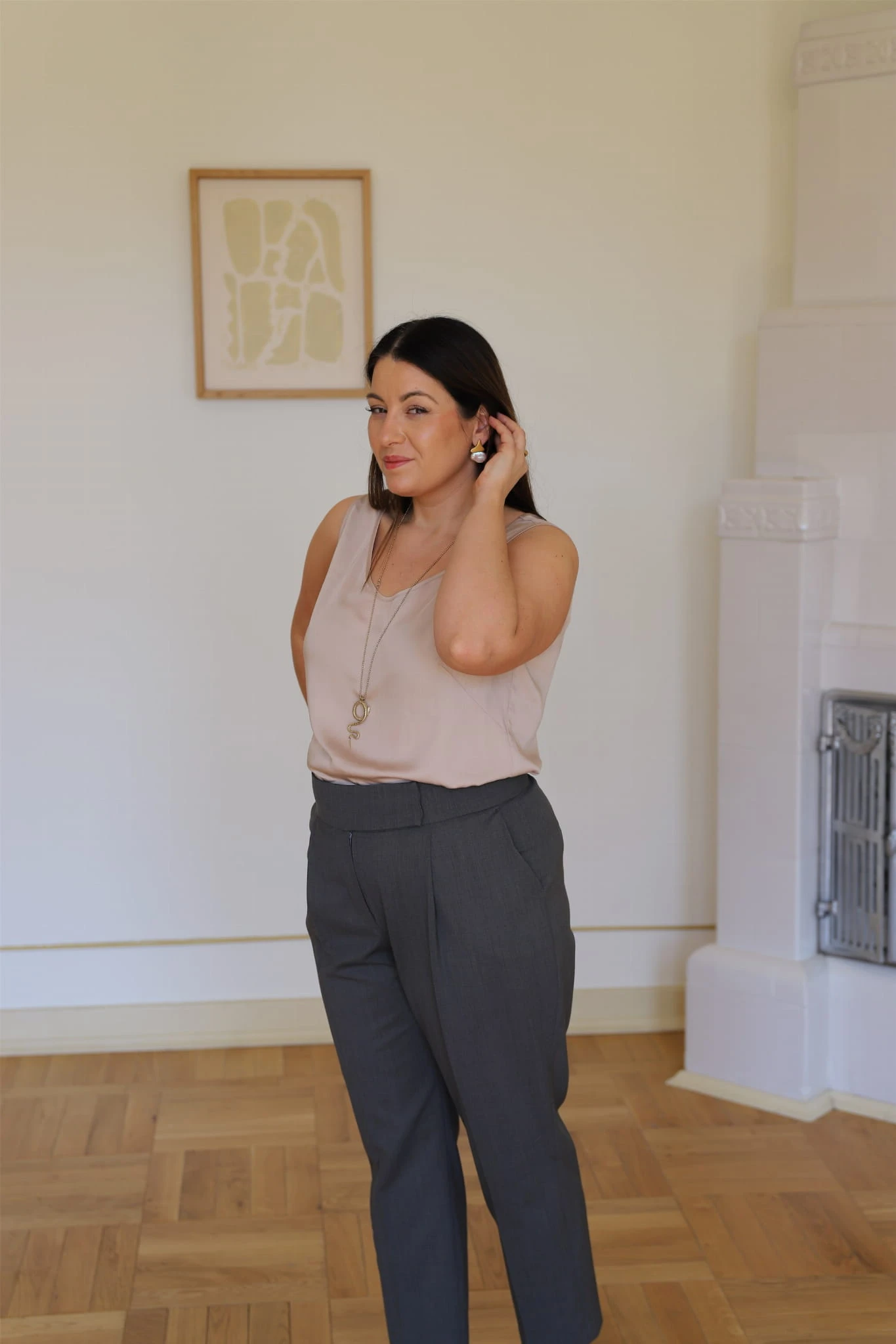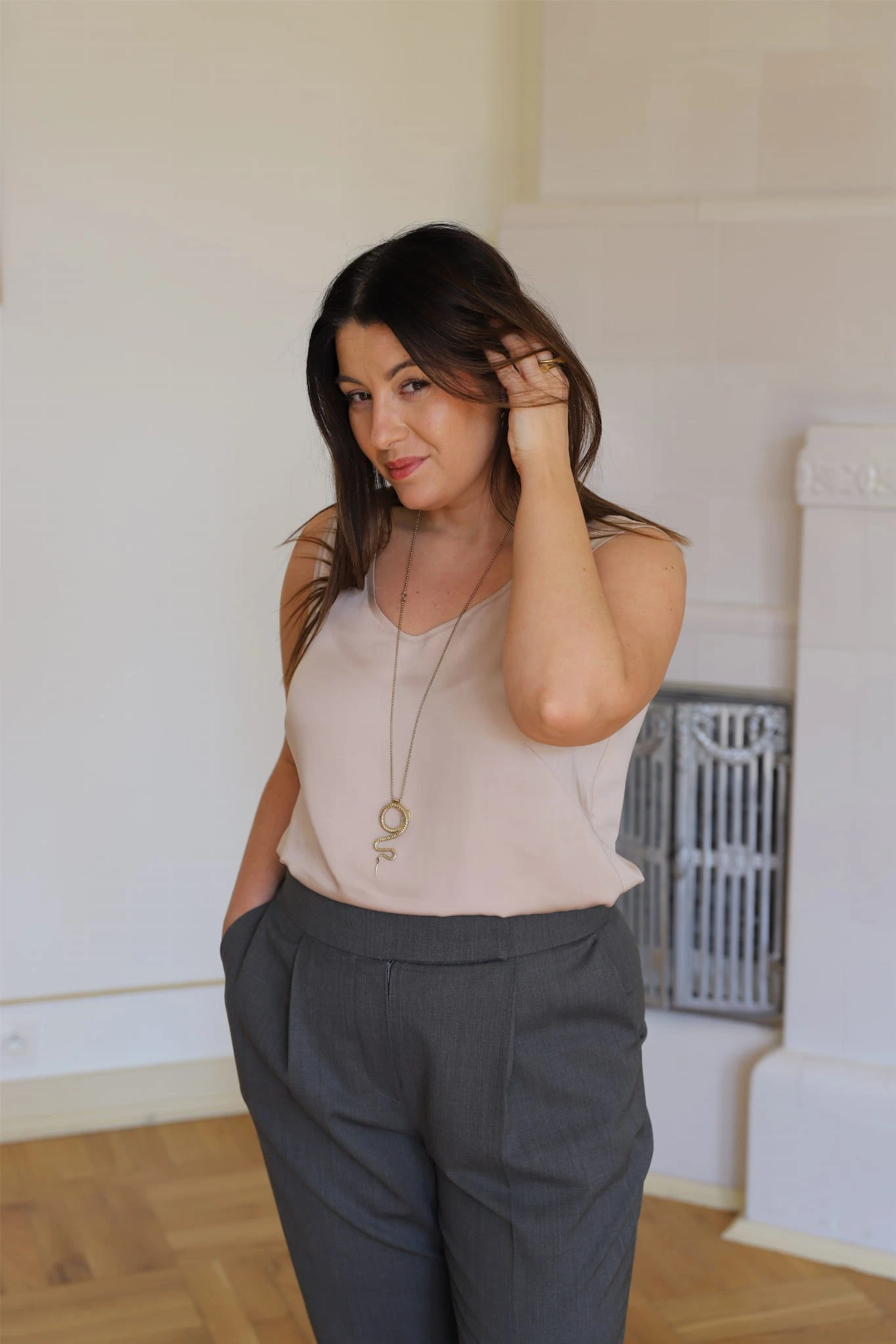 Top z autorsko wypracowanym dekoltem - formą pomiędzy V, a półokrągłym. Zaprojektowany tak, aby podkreślać kobiecość w subtelny, niewymuszony sposób.